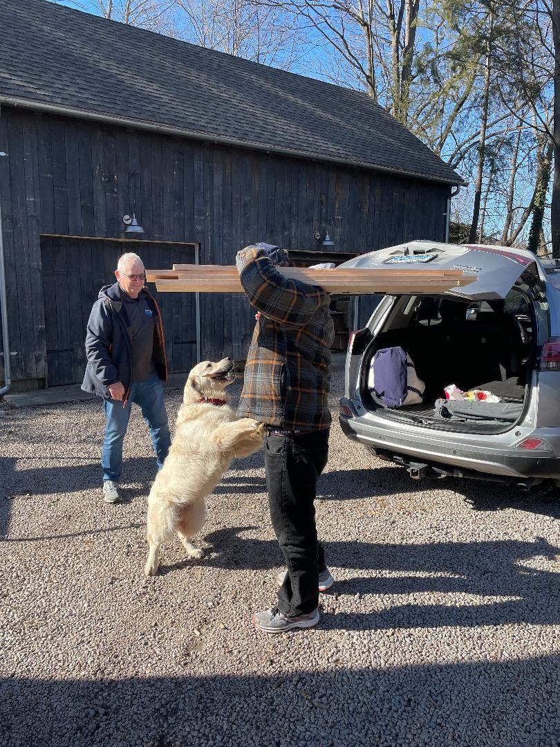 The materials list called for Mahogany wooden slats. Unfortunately, due to Covid 19 and material shortages, mahogany was not available. We ended up purchasing 1” ’x 6” wood slats from Rings End in Madison. They wouldn’t rip the boards, but Chris came to the rescue and said he could do it. So Mark and I picked up the 1” x 6” slats and brought them over to Chris’ house. Here is Mark unloading the wood for Chris to rip on his machine.