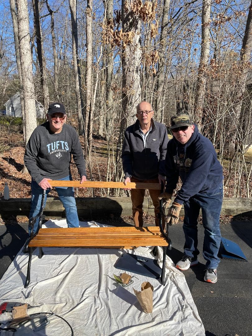 After sanding the irons and slats, spray painting two coats of primer, and one finish coat on the irons, and two coats of varnish on the slats, we were ready to assemble the slats. Here from left to right we see Harold, his friend Jim O’Connor, and Mark assembling the slats on the irons.